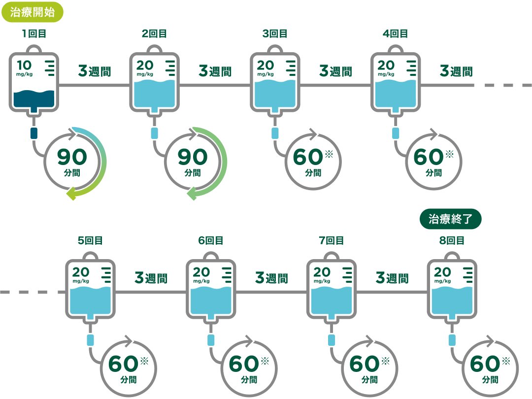 投与中、体調などに異常がなければ3回目以降の投与時間は60分に短縮します。
