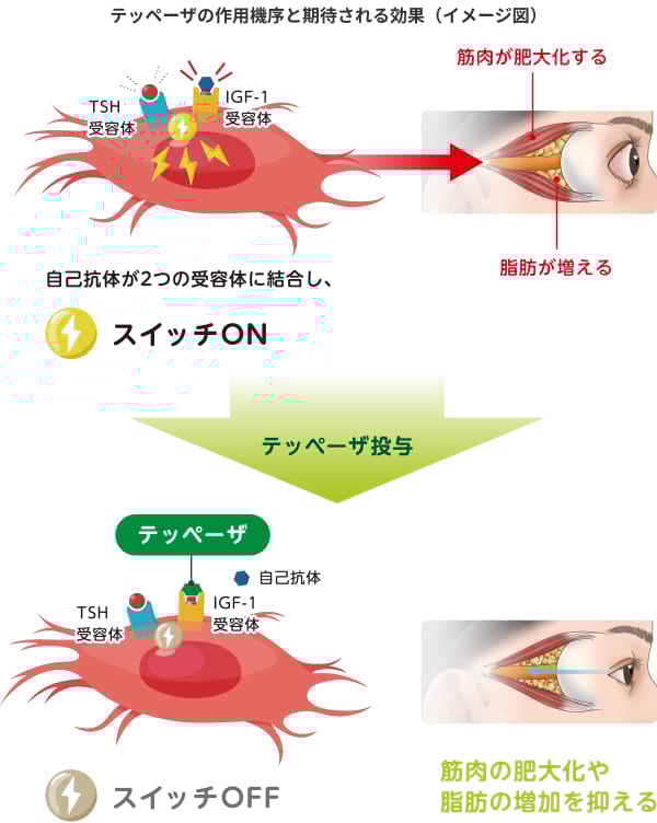 テッペーザは、自己抗体※の代わりにIGF-1受容体に結合することでIGF-1受容体のはたらきを抑え、炎症、脂肪の増加、筋肉の肥大化を抑制します。これにより、眼球突出や眼球運動の改善が期待できます。